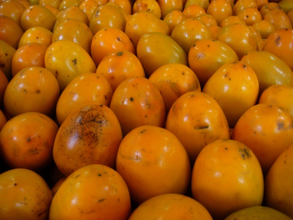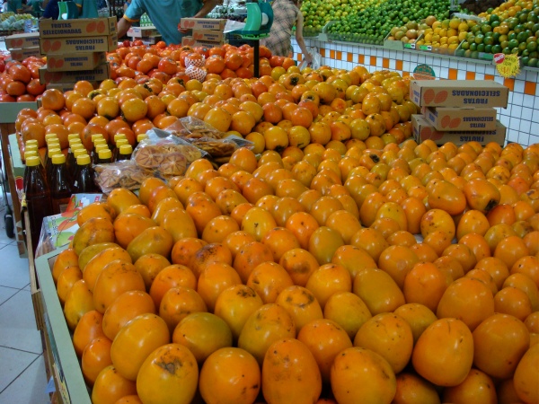 Persimmons, called "caqui" in Portuguese, came from Japan originally and have become as Brazilian as any native fruit, I swear!! There are many different varieties; I photographed a few in São Paulo (see below). (Since everything grows in Brazil, after a while people tend to think of these foods as native.) Also very popular (and grown locally) are lychee (called lichia in Portuguese) and kiwi. You should also try amora, a large blackberry-looking fruit that grows on a small tree and pitanga, a small, reddish, tart, and tasty fruit. Just about the only fruit I haven't seen in Brazil are cranberries, but I wouldn't be surprised if they started growing those, too! Blueberries are called mirtilo and are grown in the South. They are rather expensive still, though.