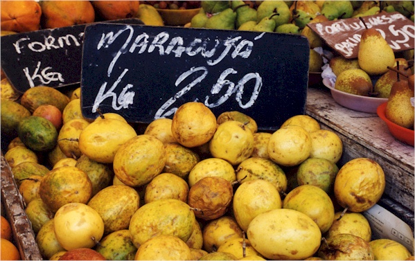 The most common batidas are made with passion fruit (batida de maracujá), cashew juice (batida de caju), and coconut milk (batida de coco). Fortunately for us, residents of these northern latitudes, these juices and the coconut milk can be found in Latin and Oriental grocers. If you can find the small bottles of Brazilian coconut milk, grab them. It's great stuff. Batidas frequently have humorous names like angels' piss, virgin's sweat, monkey's milk, etc. Enough intro, here are some great recipes I've tried over the years, courtesy of my good friends in Rio and Salvador da Bahia. Oh, and keep checking back with us, we will be adding new recipes from time to time. For more pictures of Brazilian fruits, try our Sherbets and Juices Pages.
