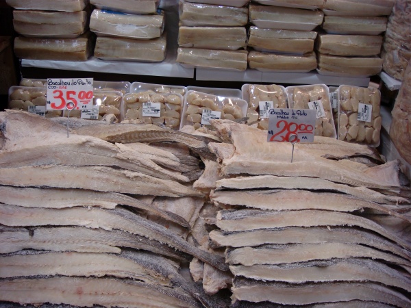 Brazilians love their salgadinhos (appetizers), which are eaten as snacks all day long or as a prelude to a more substantial meal. Here's one of my all-time favorites. Now, whether you can find salt cod where you live is a different story. It should be available all over New England and I know it's available in Canada. Salt cod needs overnight soaking or longer, until it's soft. In Brazil, good quality salt cod is available at specialty markets and (one place I can direct you to...) the central market in São Paulo, the best I've ever seen (see photos below).