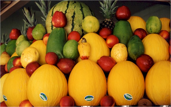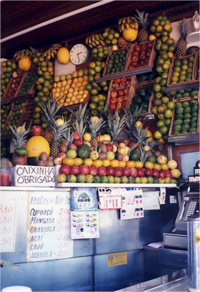 Rio has long been famous for its fruit juice bars. Any time of day or night you'll find cariocas bellying up to the bar - so to speak - to get their daily dose of natural vitamins. A couple of tropical fruits native to Brazil, cashew and acerola, pack more vitamin C than any other fruit. Then there's pineapple, passion fruit, mango, cupuaçu, papaya (left photo below), graviola (soursop in English, second from left), guavas (beautiful red ones below), etc. I never miss a chance, and was once the butt of a friendly joke. I asked for a passion fruit juice and the guy helping me shouted to the back "the lady here wants a tranquilizer" (in Portuguese "um calmante," because of the known calming properties of that fruit). It was so unexpected that everyone started to laugh. But that's typical of Rio, I think, where everybody has a stand-up comic inside, just waiting for the right moment to pop out...