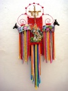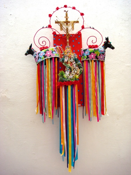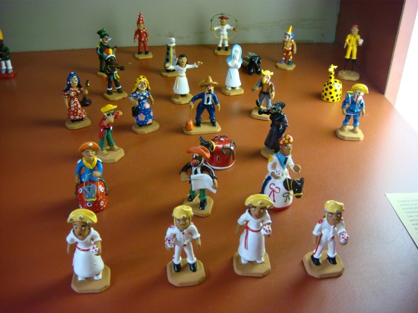 The bumba-meu-boi, (bumba-boi, boi-bumbá, etc.) is a very popular and widespread comic-dramatic dance, which tells the story of the death and resurrection of an ox. It started at the end of the 18th century in the coastal sugar plantations and cattle ranches of northeastern Brazil and from there it spread to the north and south. Its name comes from the verb bumbar, meaning to beat up or against, and the expression is chanted by the crowd as an invitation for the ox (the men under the ox costume) to charge against them. It's represented here by tiny clay figurines from Pernambuco.