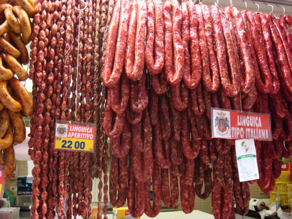 Pictured above from left: salt pork, carne seca, and sausages at the central market in São Paulo.