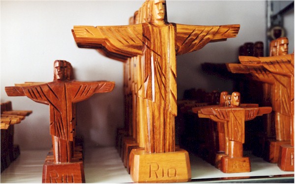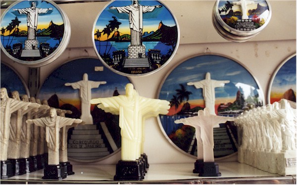 Our favorite souvenirs from Rio are what we call "Corcovado Kitsch," those miniature Christ statues in wood or soapstone, as key rings, plates, etc. We find them irresistible, especially now that the monument has been chosen as one of the new Seven Wonders of the World. You can buy them atop the mountain or at the Sunday market on General Osório Square in Ipanema. We took pictures of our favorites: