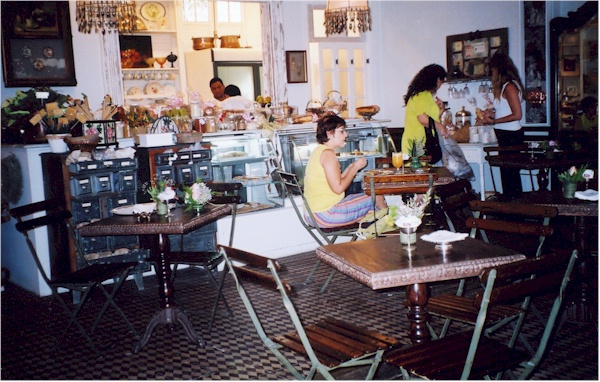Garcia & Rodrigues, Avenida Ataulfo de Paiva, 1251 A-B. It's a beautiful and fancy place, very European feel. The decor alone is worth a visit: tiled floors, antique furniture. Fabulous breads and all kinds of wines, kitchen gadgets, and assorted gifts for the home. One of the best places to run into celebrities, if you're into that sort of thing. Bistrô Escola do Pão is a good, rather expensive, choice in Lagoa; they're at Rua General Garzon, 10, 2294-0027. On the cheap, try having breakfast at a "padaria" or bakery. I love the "café com leite com pão canoa e queijo de Minas" at Rio Lisboa in Leblon. This translates into coffee with milk, French bread toasted with melted white cheese...something like that! Other restaurants offering breakfast menus are Chaika, and Doce Delícia (see below), Geographic Café, Rua Visconde de Pirajá, 511, and Alessandro & Frederico at the corner of Garcia d'Ávila and Barão da Torre. Armazém do Café at Rua Visconde de Pirajá, 261, Ipanema serves the best coffee in Rio, according to my friend Ligia, who's an expert on these things. They're also in Leblon next to Cafeína. |