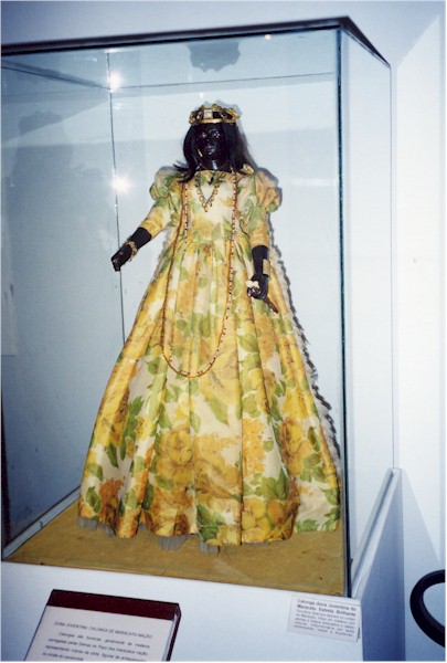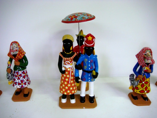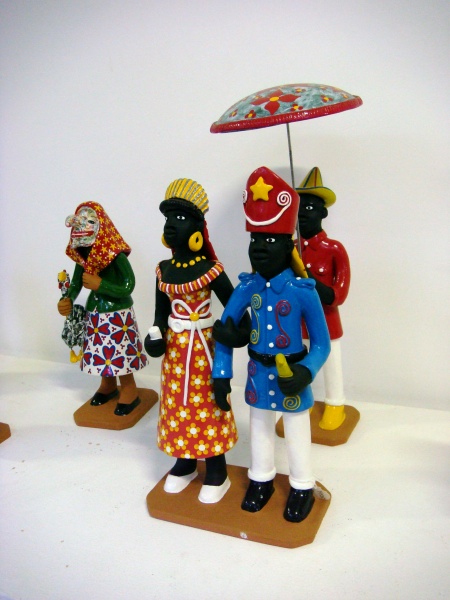The maracatu is composed of a small percussion orchestra with several types of drums, agogô, rattles; women dancers and a male singer. They parade to the rhythm of the drums, wearing beautifully decorated costumes. The soloist sings a song and the chorus of women answers with the refrain. The standard bearer is followed by the king and queen of the maracatu (represented above in clay), and the man who carries a large colorful umbrella adorned with fringes symbolizing the sun. The woman in front of the group of dancers carries a doll called the calunga. This doll is supposedly a fetish.