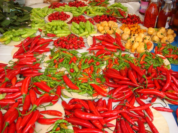 This is the molho à campanha to which are added some liquid from the feijoada and some malagueta peppers (small, hot Brazilian peppers, shown here bottled and loose, center of second photo). To see more Brazilian peppers, visit our At the Feira 2 page.