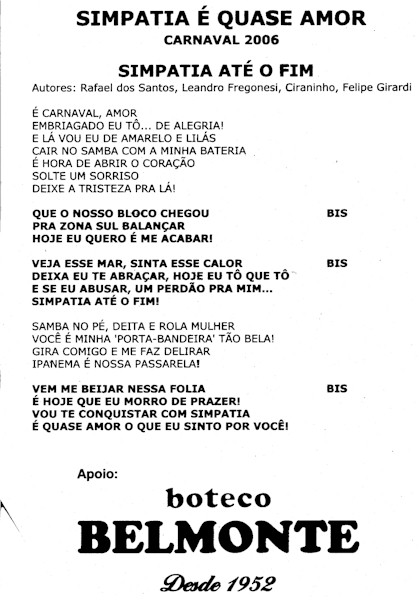 Fortunately it is still possible to enjoy street carnaval with the groups called blocos or bandas that are followed by tens of thousands in the neighborhoods of Rio. They have whimsical or humorous names like Suvaco do Cristo (Christ's Armpit, because participants live in the area under the famous statue of Christ) or Simpatia É Quase Amor (Sympathy Is Almost Love) from Ipanema, or Escravos da Mauá downtown. The oldest and most traditional, Cordão do Bola Preta, opens the celebrations Saturday morning at 9; they also have dances and parties all year long at their headquarters downtown Rio. Schedules start to appear online and in the local papers a couple of weeks in advance, so you can plan where and when you'll be dancing on a certain day. Hooray for small blocos also and all those unforgettable marchinhas...But, guys, get rid of those stupid foam cans and the beer carts in the middle of the crowds! It's becoming unbearable to go out after our favorites!!