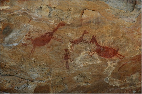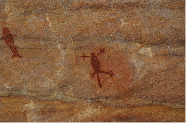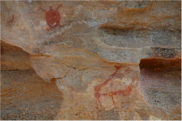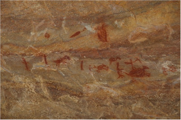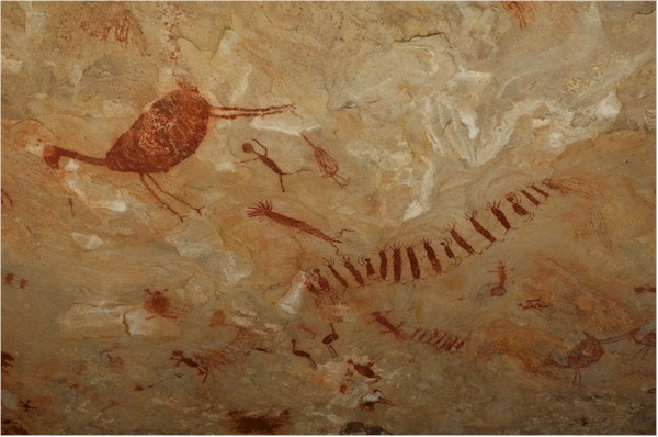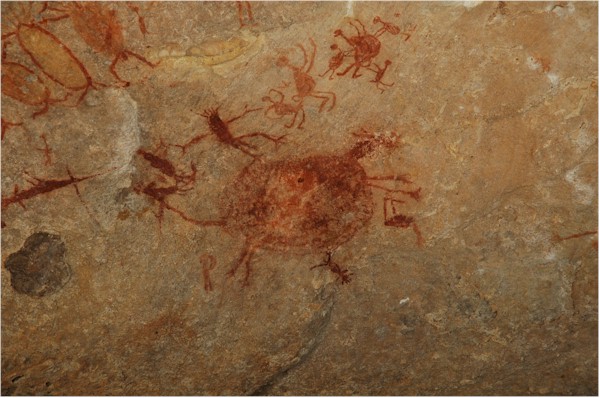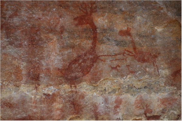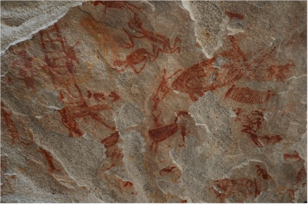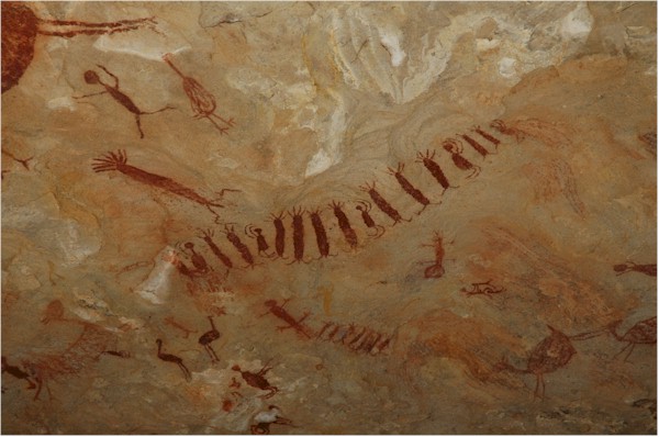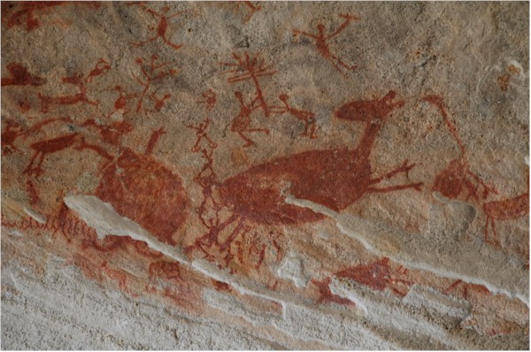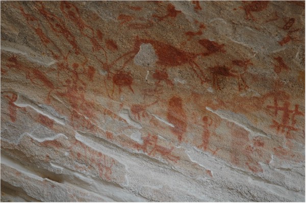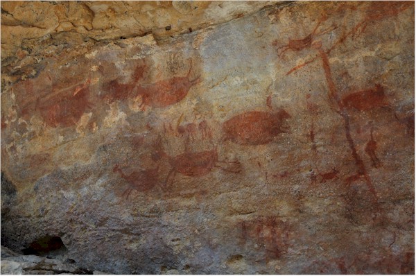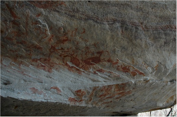The paintings include animals, trees, beehives, and scenes of rituals, hunting, violence (even torture), sex, birth, etc. They range from 25,000 to 2,000 years ago. The region used to be covered by tropical forests and the paintings are in places where the inhabitants would find shelter, in what Brazilians call "boqueirão" (gully, large cave) and "toca" (small cave, den).